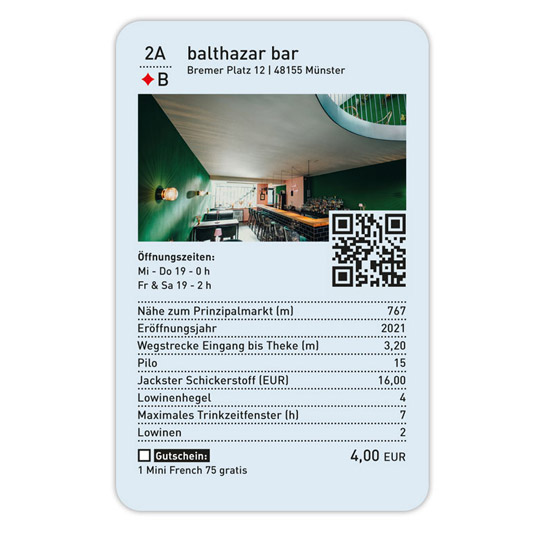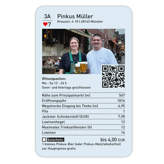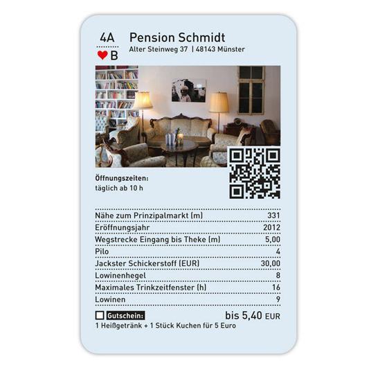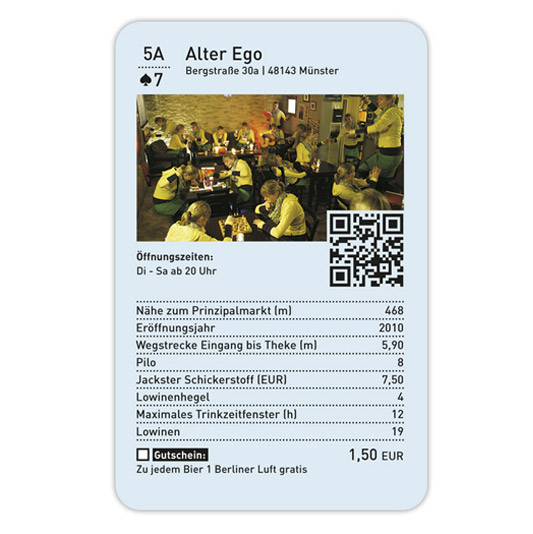 Bereits in 20. Auflage gibt die Agentur Sonnendeck aus Münsters Kreuzviertel das Münsteraner Kneipenquartett heraus. Es hält als interessante Kombination aus Kartenspiel und Gutscheinheft wie gewohnt viel Wissenswertes über 33 Kneipen, Restaurants, Cafés und Bars rund um den Prinzipalmarkt parat.